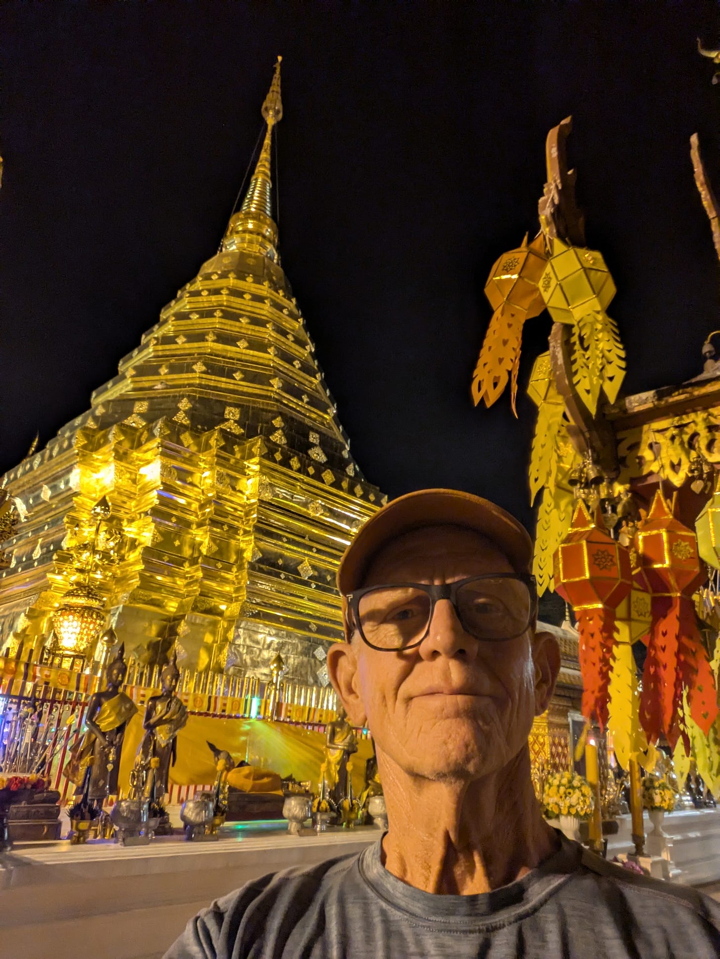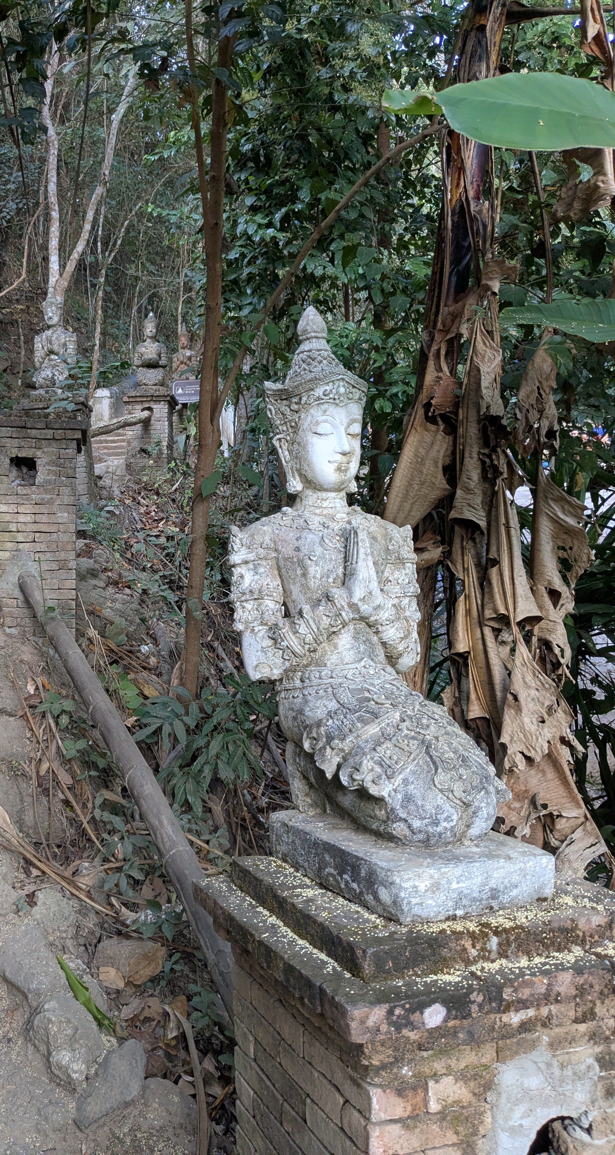 I had such lofty goals for this post but talking with others got in the way. I twisted and turned about weaving this outing into current world affairs. Fortunately, sharing kindness interrupted. Here on the side of the 1676 meter, granite mountain, Doi Suthep, this lumbering old Dutch-American guy met with two young German girls, a Japanese lady, a Cuban-American woman, two parents from Seattle (mother by way of Taiwan) and a Swedish student studying in Bangkok. Our host for the jaunt was a young woman, Kungnang, who explained and displayed what Buddhism is for her and her family.